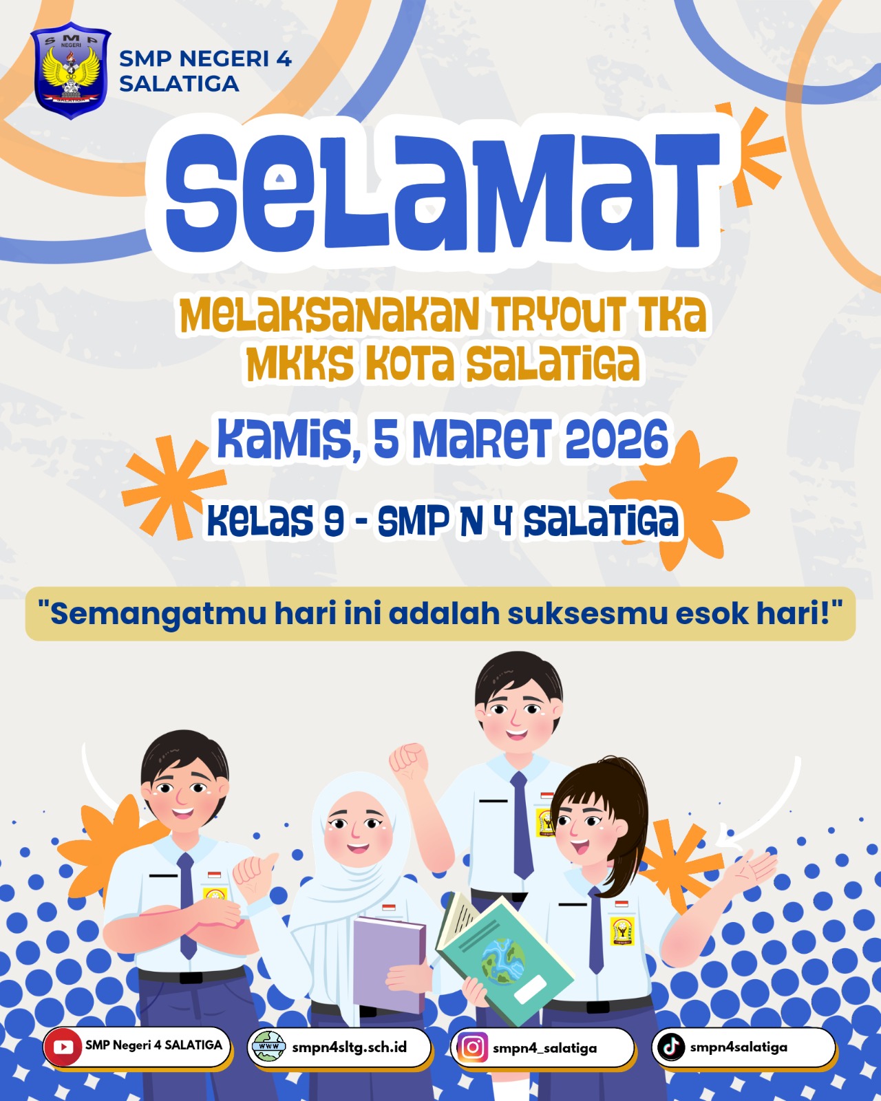 Di tengah pelaksanaan Asesmen Sumatif Tengah Semester (ASTS) Genap, SMP Negeri 4 Salatiga melaksanakan kegiatan Try Out 2 Tes Kemampuan Akademik (TO 2 TKA) pada Kamis, 5 Maret 2026. Kegiatan ini merupakan hasil kerja sama MKKS SMP di Kota Salatiga sebagai bagian dari upaya mempersiapkan siswa kelas IX menghadapi asesmen akhir.